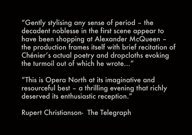The actual poetry of Andrea Chenier had never been translated into English. This became the stimulus for aspects of the video and sound world that existed with the music by Giordano. Reading and projection of the poetry prefigures the playing of the orchestral score in the live performance; introducing the audience to the real existence of the writer who was executed during the French Revolution. The video animation evolved collaboratively from paintings of the poetry and from filming paint thrown, dripped and written onto perspex surfaces.